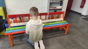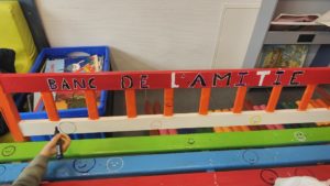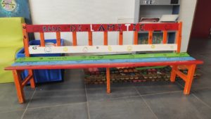 Voilà des jeux pour les enfants dans la cour de maternelle installés par Imagin’Aires et financés par l’APEL et l’école : un circuit de voitures en EPDM de 7m² en forme triangulaire avec divers modules : pont, tunnel, trous, chicane, lac, foret… Ainsi qu’une zone en EPDM avec différents modules pour se reposer, sauter, courir autour, apprendre la marche et l’équilibre… et des bancs.
