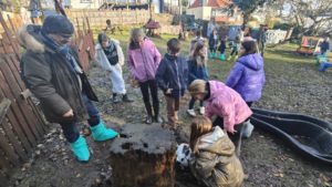 Le matin ils ont travaillé autour des arbres : ils ont travaillé le toucher (tronc, mousses…), ils ont appris à dater un arbre à partir d’une coupe d’arbre, ils ont appris à reconnaitre et nommer les arbres à partir de la forme des feuilles, ils ont appris du vocabulaire comme « pétiole », et ils ont appris à mesurer la taille d’un arbre avec la croix du bûcheron.