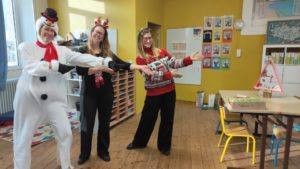 Pour fêter Noël, la troupe « Margoden Théâtre » est venue à l’école pour montrer leur spectacle de marionnettes à fils aux élèves de maternelle, de CP et de CE1. Le titre était « Bill Bulle » et c’était tiré d’un conte de Grimm.