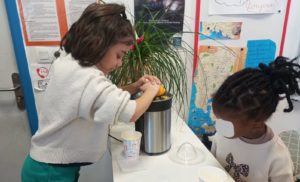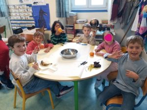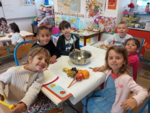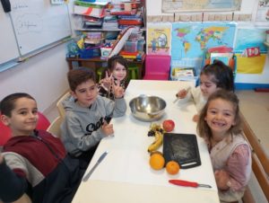Avant les vacances de la Toussaint, les élèves de CP de Cathy ont préparé une salade de fruits en utilisant différentes actions : éplucher, couper et presser.