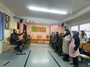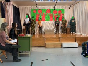 Au moment de leur arrivée, l’école était en pleine préparation de la fête nationale : les enfants, avec leur professeur de chant et celle de théâtre leur ont montré ce qu’ils feront le jour de la fête nationale reprenant des mises en scène de moments forts de la guerre.